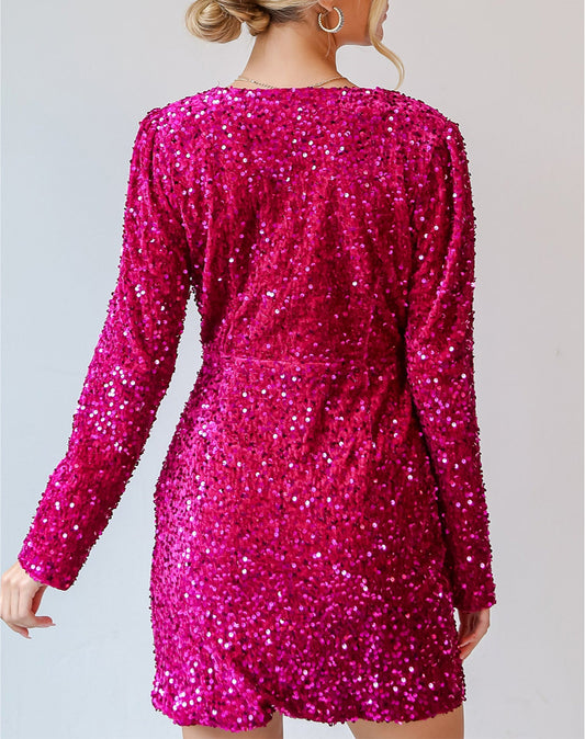 Sequin Long Sleeve V Neck Wrapped Mini Dress