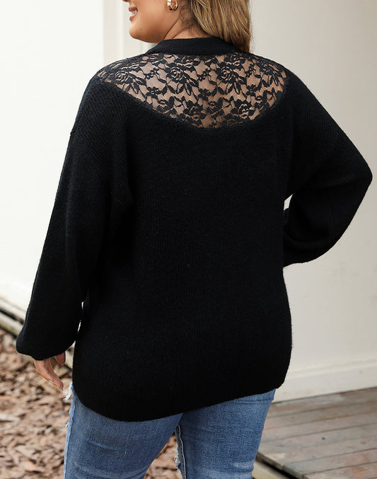 Plus Size Ribbed Knit Lace Splicing High Neck Sweater