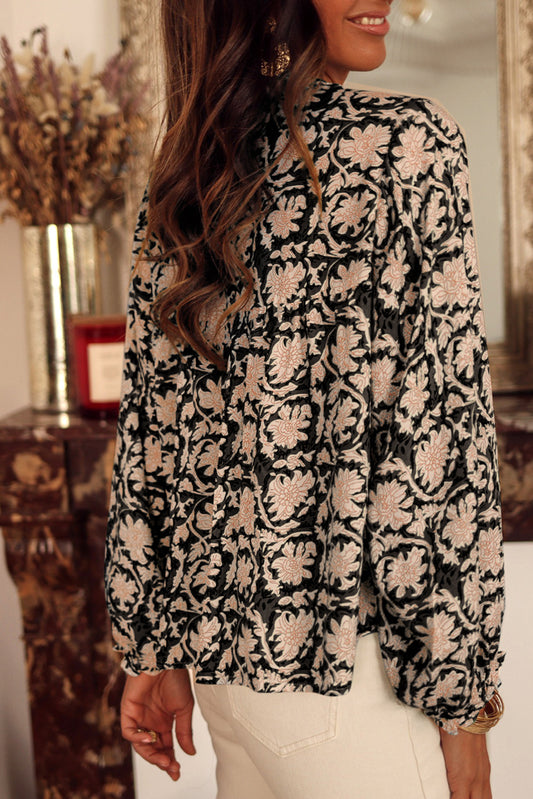 Floral Print Split Neck Pleated Puff Sleeve Blouse