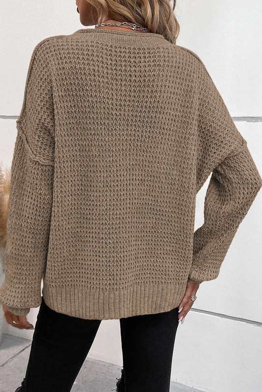 Pointelle Knit Button V Neck Drop Shoulder Sweater
