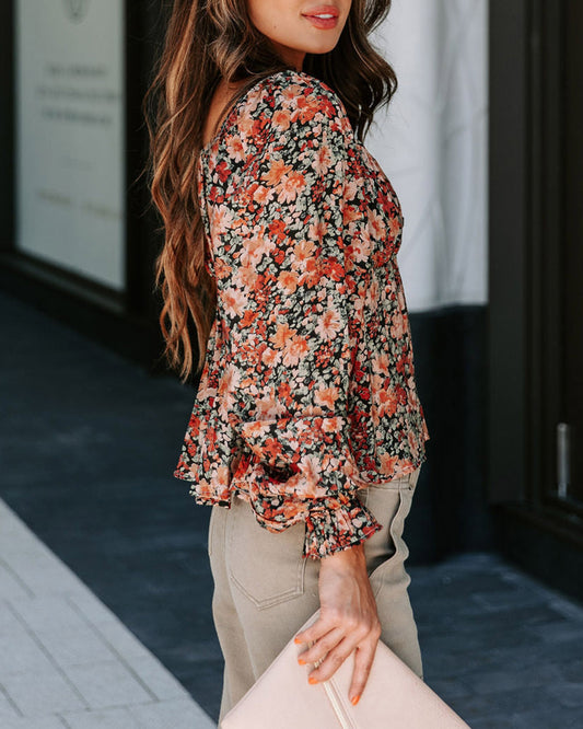 Floral Flounce Sleeve Front Tie Sweetheart Neck Blouse