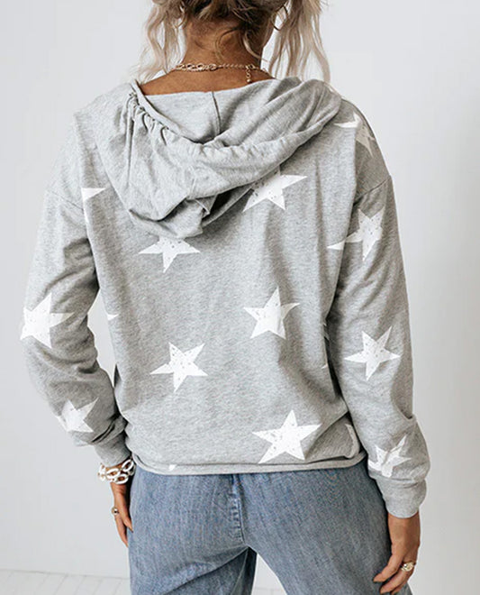 Grey Stars Print V-Neck Drawstring Hoodie