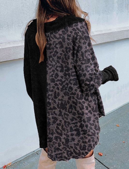 Leopard Patchwork Waffle Knit Buttoned Blouse