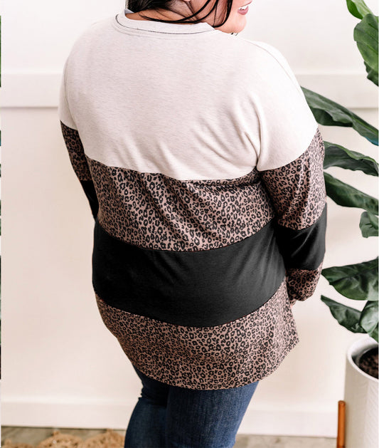 Leopard Print Colorblock V Neck Long Sleeve Plus Size Top