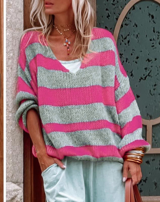 Striped Colorblock Knit V Neck Loose Fit Sweater