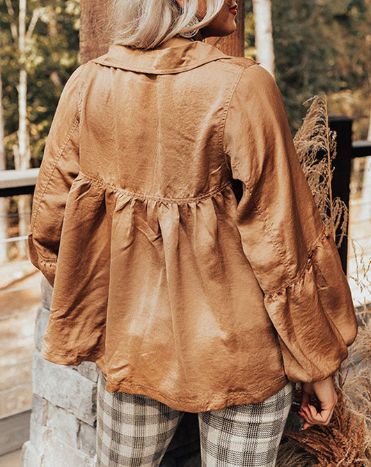 Puff Sleeve Collared Pleated Babydoll Blouse