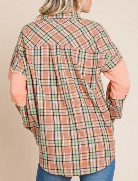 Crinkled Patchwork Plaid Print Oversized Shirt