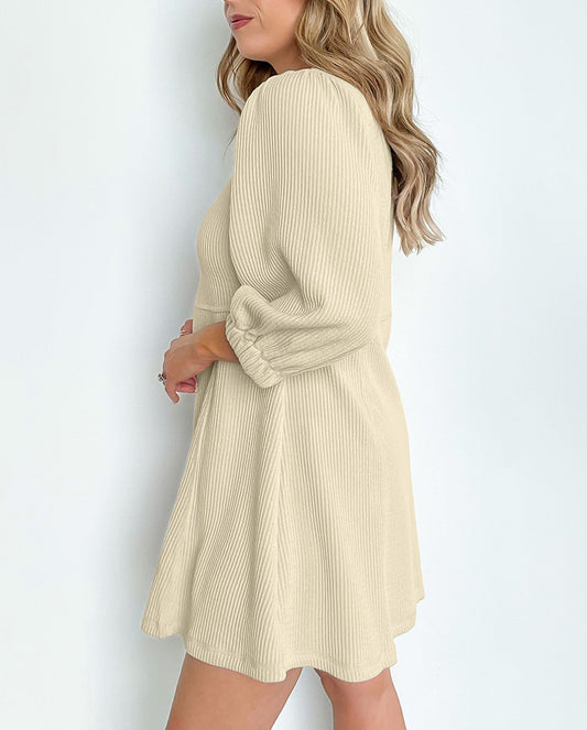 Ribbed Knit Puff Sleeve Flared Mini Dress