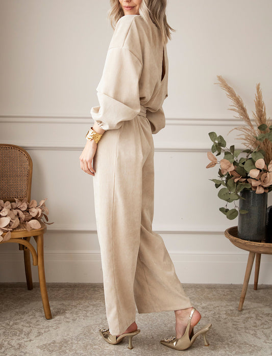 Keyhole Back V Neck Tie Waist Loose Jumpsuit
