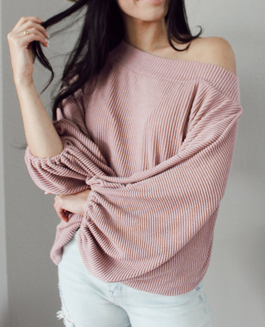 One-Shoulder Balloon Sleeve Ribbed Blouse