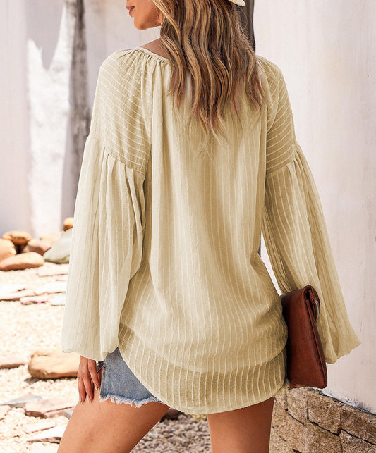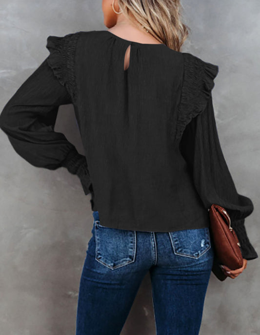 Crinkle Ruffle Trim Keyhole Puff Sleeve Blouse