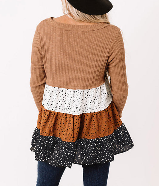 Ribbed Long Sleeve Dotted Tiered Ruffled Flowy Top