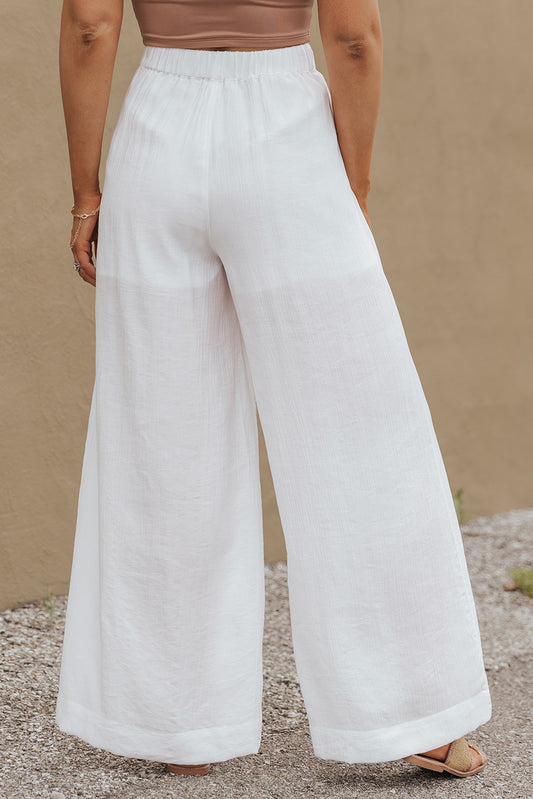Solid Color Elastic Waist Pleated Wide Leg Pants