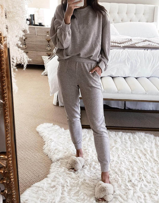 Long Puff Sleeve Top Pocketed Casual Two Piece Set