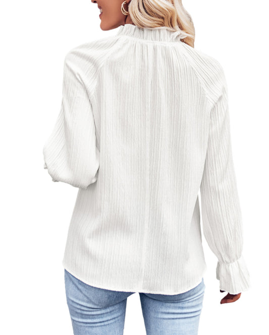 Frilled Mock Neck Ripple Bubble Sleeve Blouse