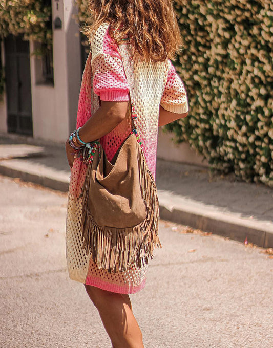 Ribbed Short Sleeve Ombre Eyelet Knitted Cardigan