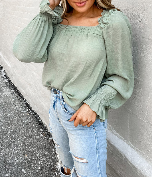 Ruffled Square Neck Cuffs Long Sleeve Blouse