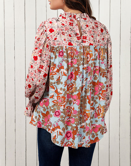 Floral Plaid Mixed Print Bishop Sleeve Patchwork Top with Slits