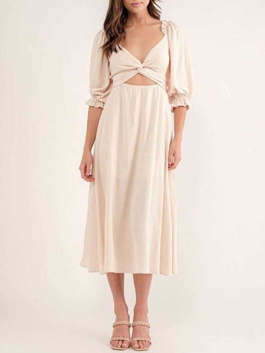 Beige Puff Sleeve Cross Tie Cut Out Maxi Dress