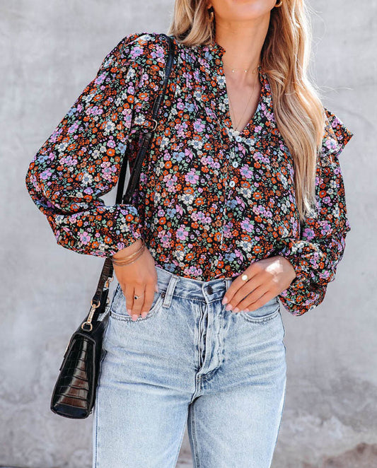 Split Neck Ruffled Puff Sleeves Floral Top
