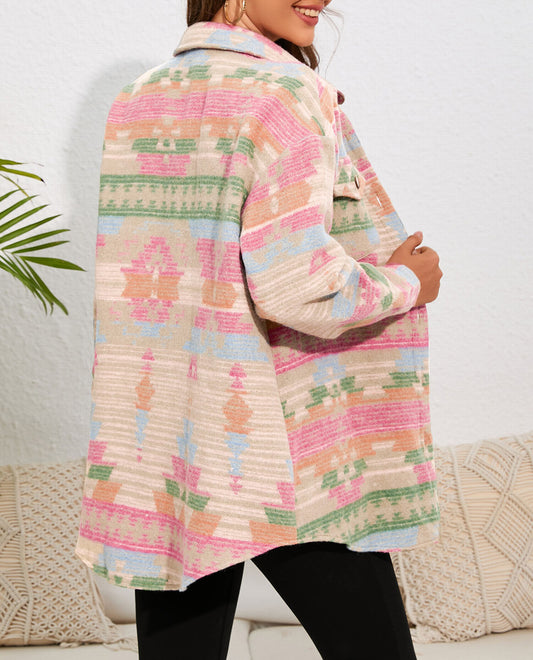 Western Aztec Print Button Flap Pocket Shacket