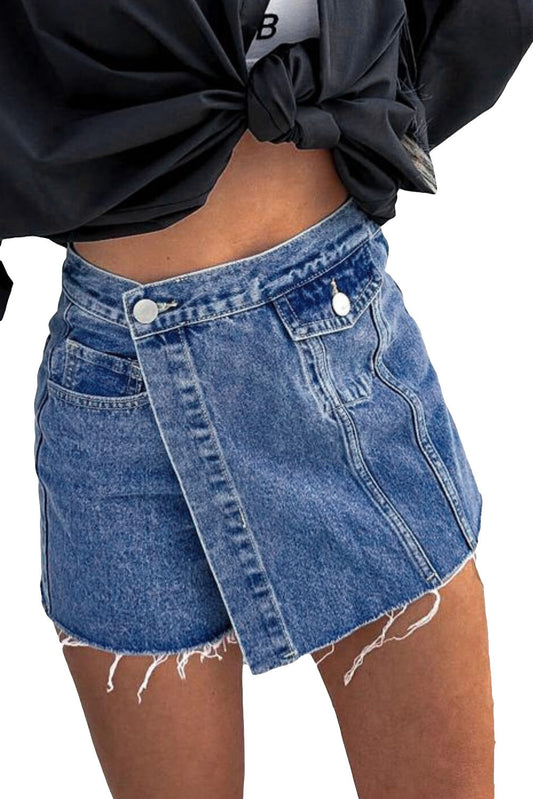 Blue Button Wrap Over Raw Hem Denim Shorts