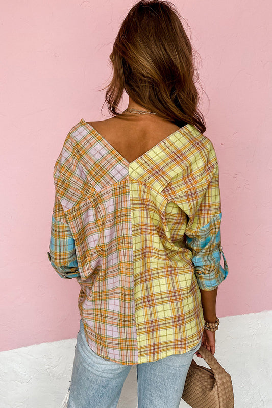 Mixed Plaid Long Sleeve V Neck Buttoned Shirt