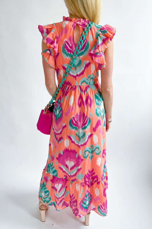 Abstract Floral Print Frill Neck Ruffle Maxi Dress