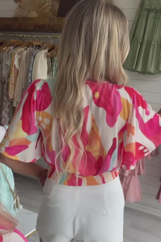 Abstract Floral Long Sleeve Tied Ruffle Dress