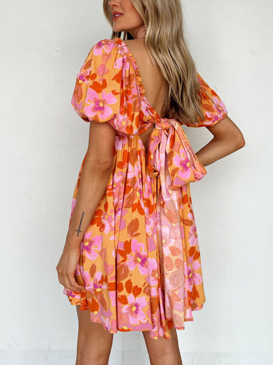 Puff Sleeve Bow Knot Open Back Floral Mini Dress