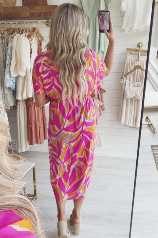 Tropical Leafy Print Drawstring V Neck Midi Dress