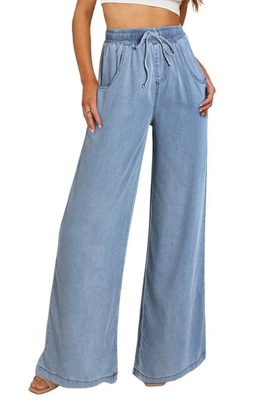 Blue Drawstring Waist Wide Leg Tencel Denim Pants