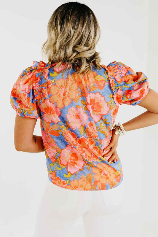 Floral Bubble Sleeve V-Neck Plus Size Blouse