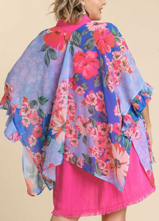 Blue Floral Print Ruffled 3/4 Sleeve Loose Fit Kimono