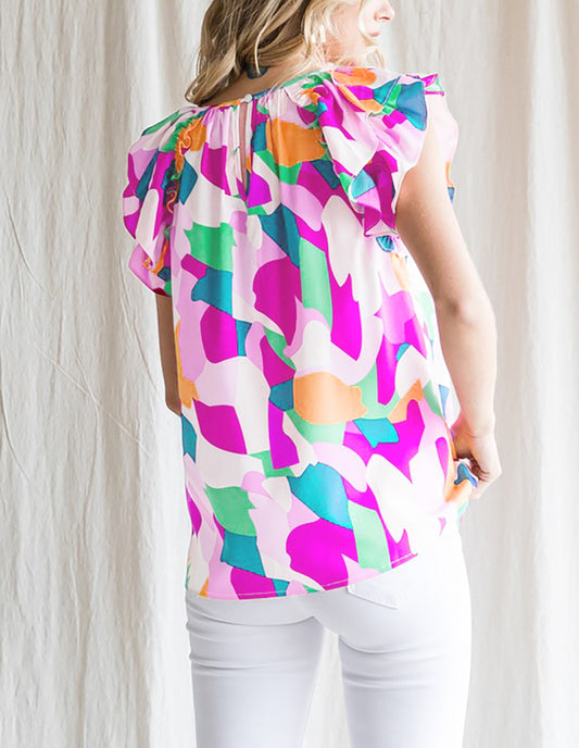 Abstract Pattern Ruffle Short Sleeves Blouse