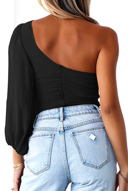 Black One Shoulder Mesh Long Sleeve Bodysuit