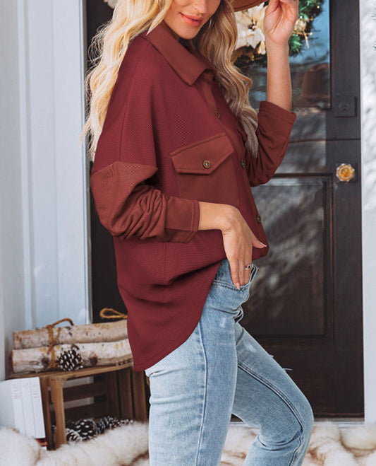 Red Waffle Knit Patch Pocket Shacket