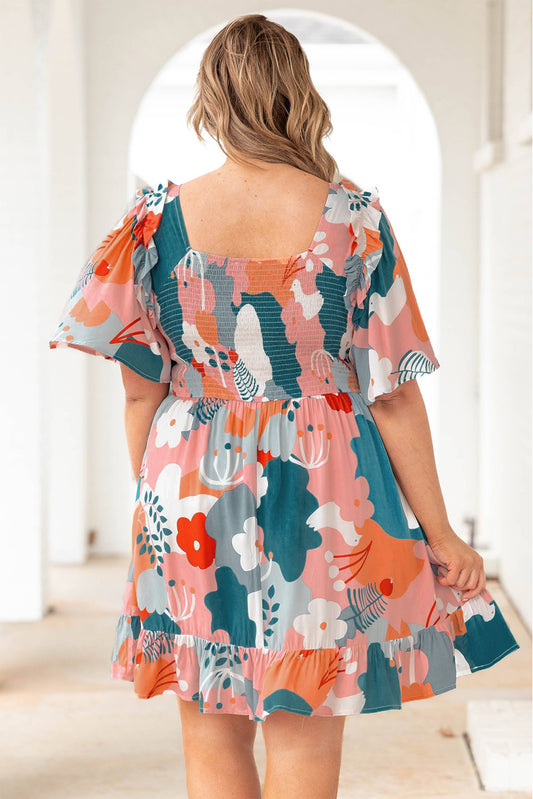Multicolor Plus Size Shirred Mixed Print Ruffle Dress