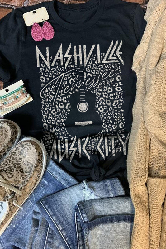 Black NASHVILLE MUSIC CITY Leopard Graphic Print Tee