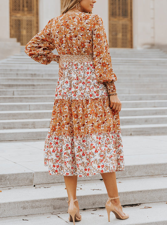 Orange Mix Floral Patchwork Frill Tiered Dress