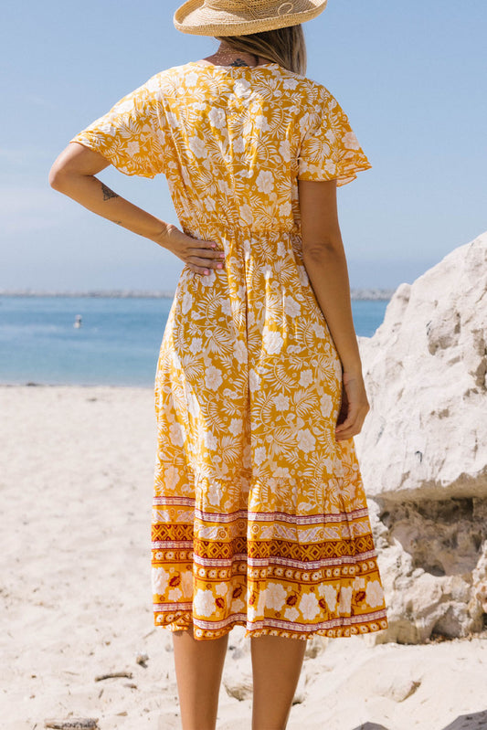 Yellow Floral Wrapped V Neck Tied Ruffled Sleeves Midi Dress