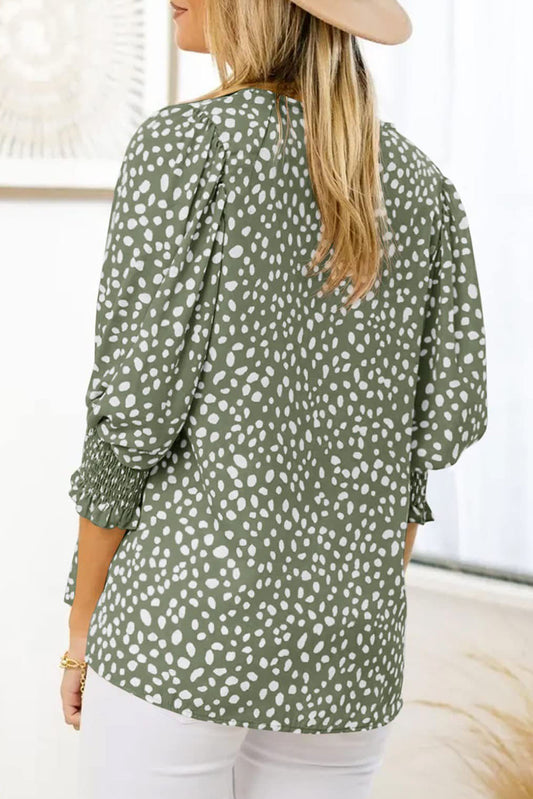 Green Leopard Print Shirred Cuff 3/4 Sleeve Blouse