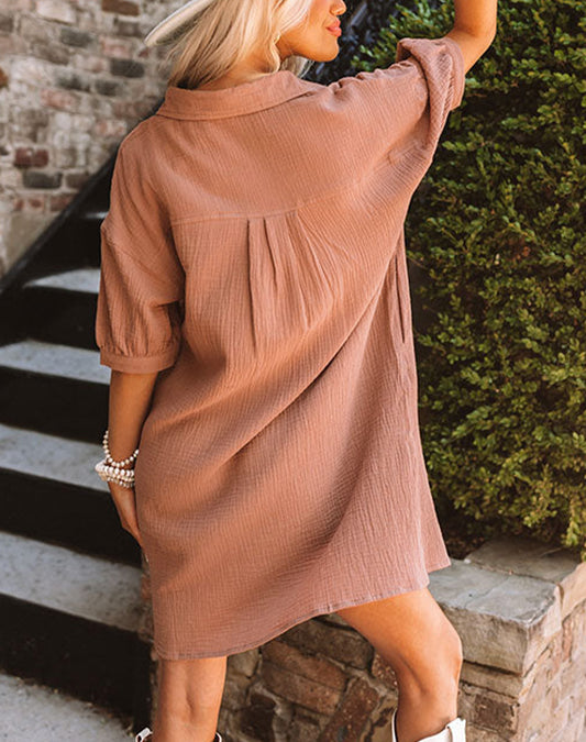 Brown Crinkle Textured Joint Bubble Sleeve Shirt Dress