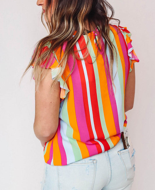 Multicolor Plus Size Stripe Print Frill Neck Flutter Blouse