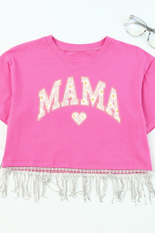 Pink MAMA Heart Daisy Print Rhinestone Fringed Cropped Top