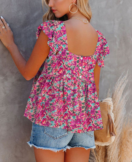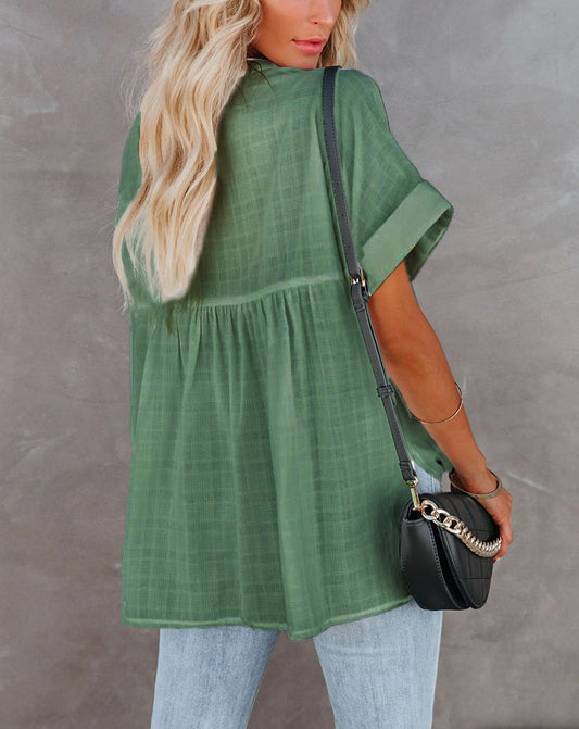 Green Plaid Print Loose V Neck Short Sleeve Shirt with Slits