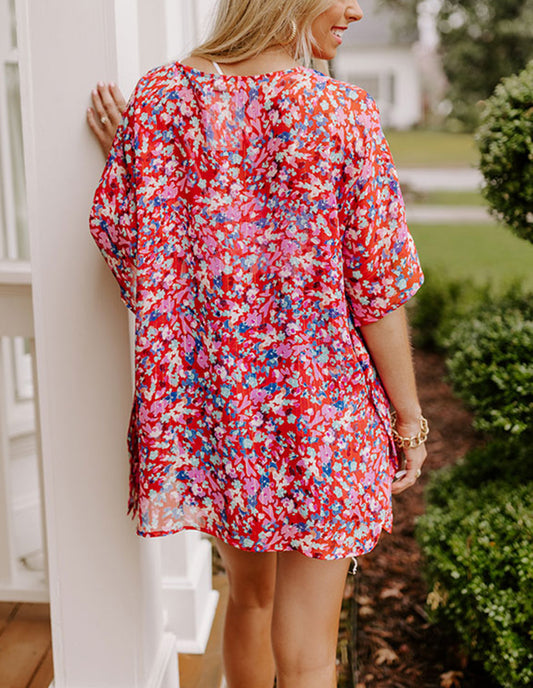 Orange Plus Size Square Neck Tie Sleeve Floral Dress