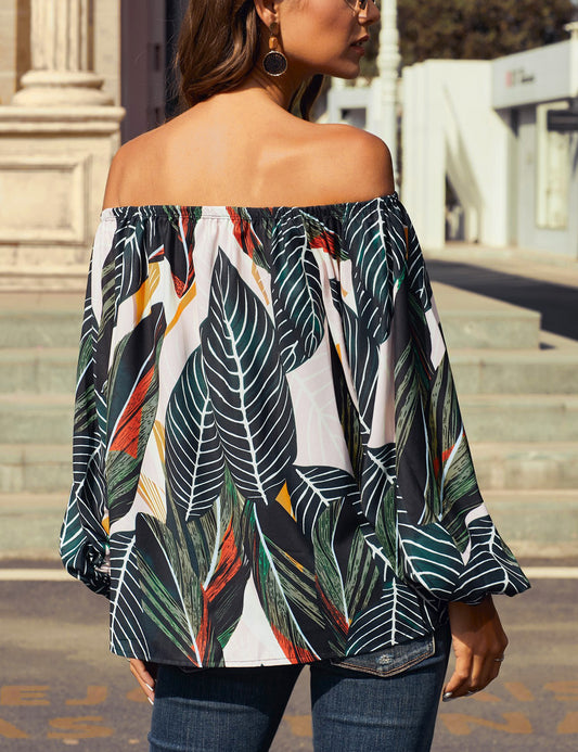 Green Leaves Print Elastic Neck Off Shoulder Top