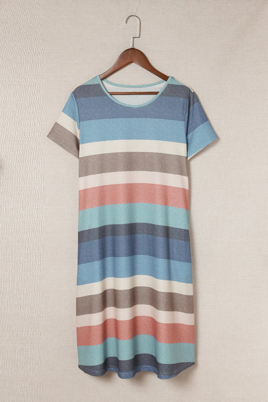 Multicolor Striped Drawstring V Neck T Shirt Dress
