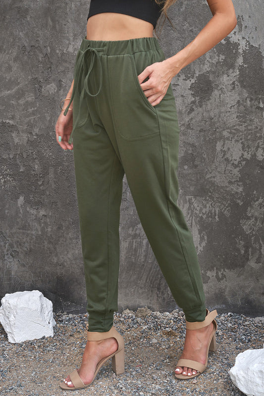 Army Green Pocketed Drawstring Casual Pants